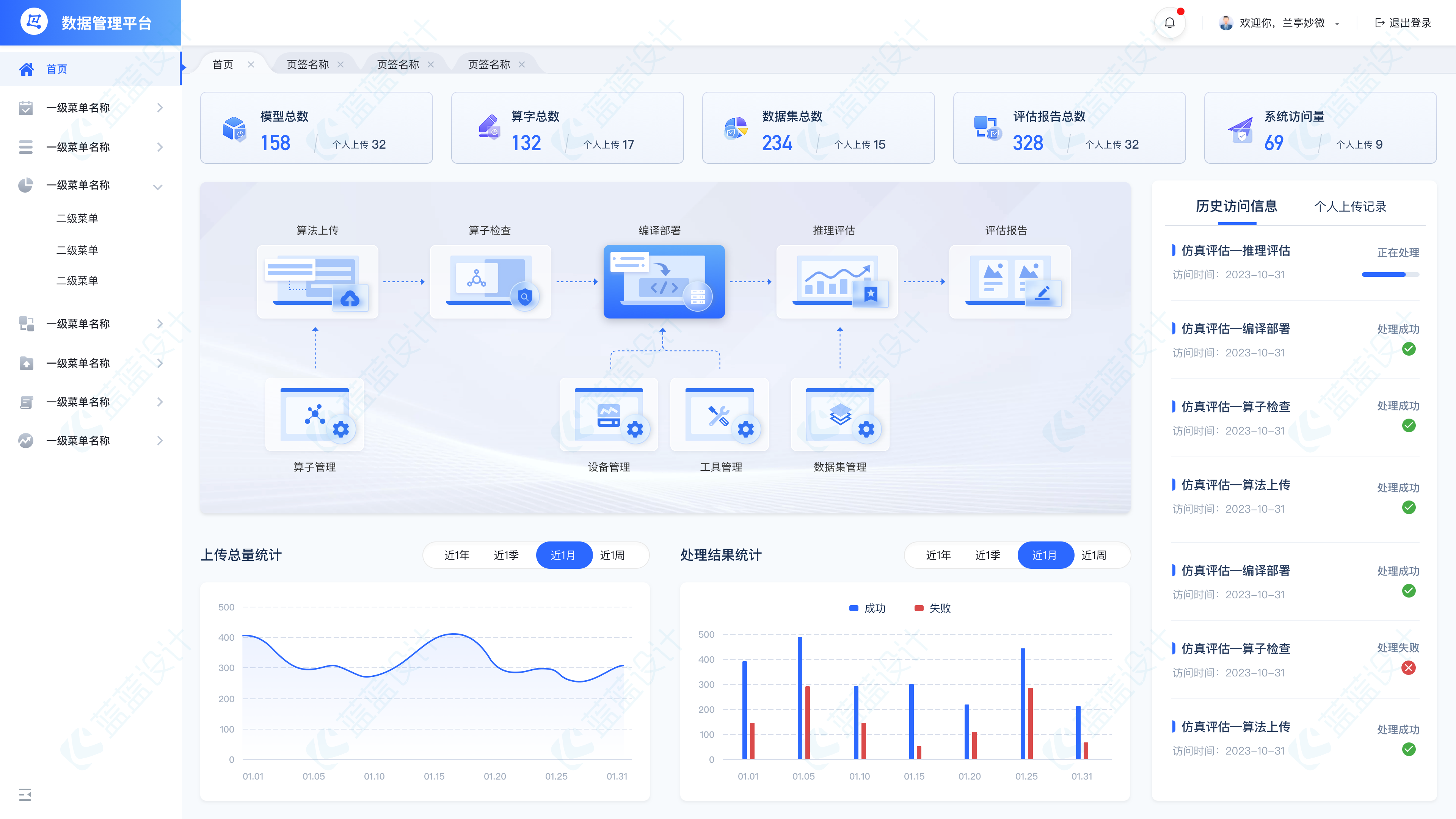 (二)該系統(tǒng)的原首頁中信息量比較少,在設(shè)計(jì)時(shí)除了對(duì)頁面美觀的優(yōu)化,從內(nèi)容、布局、用戶使用場(chǎng)景、使用習(xí)慣、交互方式等方 面也進(jìn)行考慮,增加了一些統(tǒng)計(jì)的圖表, 「歷史訪問信息」采用卡片式列表,突出模塊和內(nèi)容。同時(shí)增加「?jìng)€(gè)人上傳記錄」信息和「歷史訪問信息」可以進(jìn)行 切換查看。
