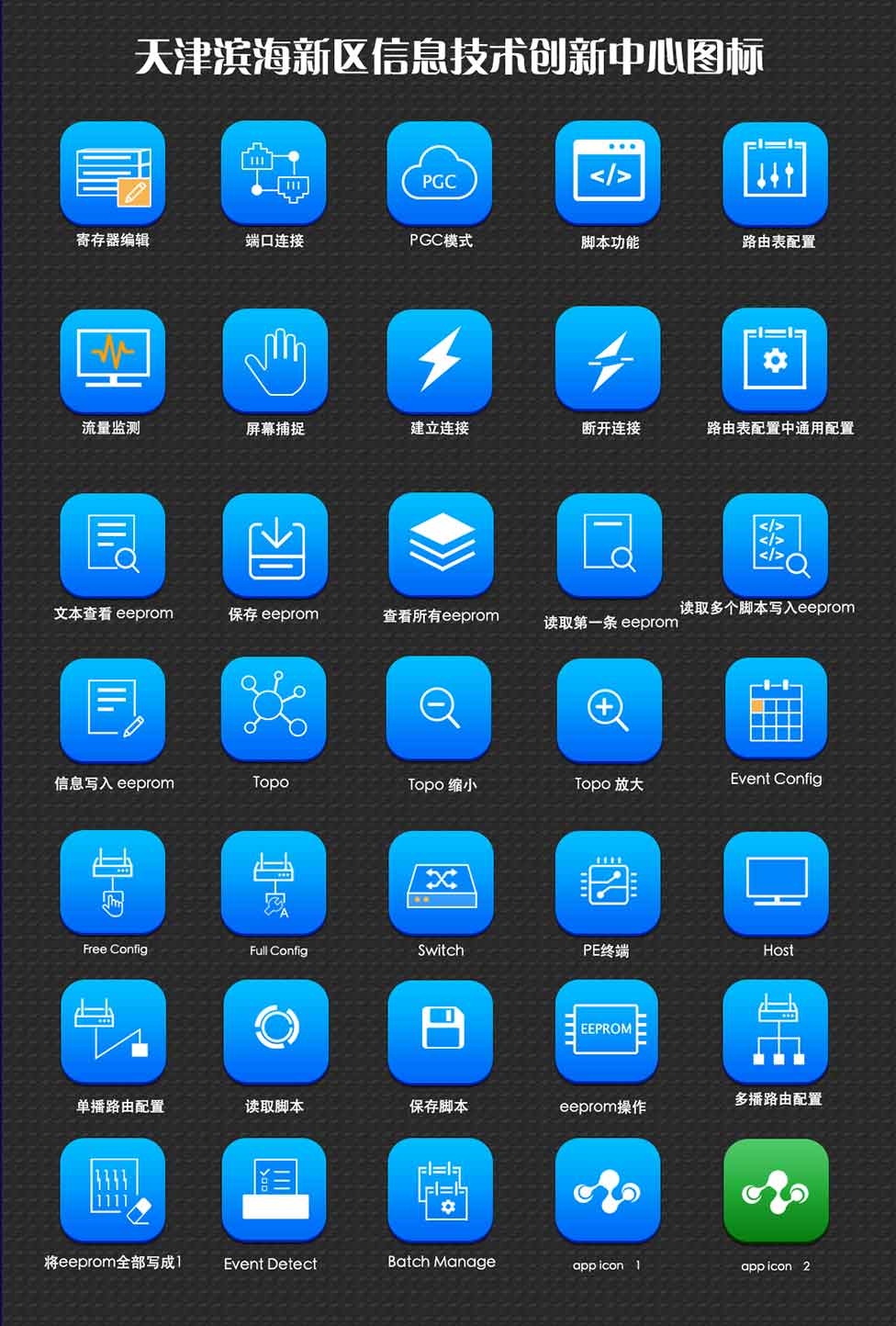 蘇野芯片高速串行rapidio芯片配置軟件是一款芯片功能監(jiān)測,配置及調(diào)試的軟件,其復(fù)雜程度高,專業(yè)性極強,需要反復(fù)與客戶溝通,理解背后含義才能設(shè)計出符合產(chǎn)品特征的圖標(biāo)。